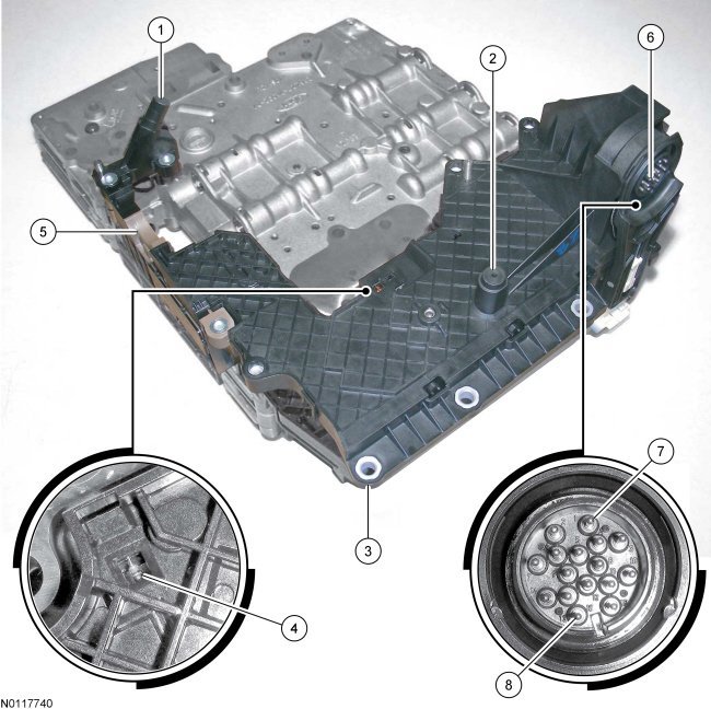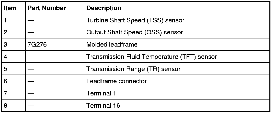 The PCM controls the electronic functions of this transmission. A plastic molded leadframe is bolted to the main control assembly. The leadframe contains the Turbine Shaft Speed (TSS), Output Shaft Speed (OSS), Transmission Fluid Temperature (TFT) and Transmission Range (TR) sensors.