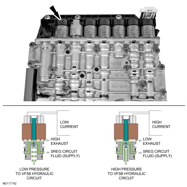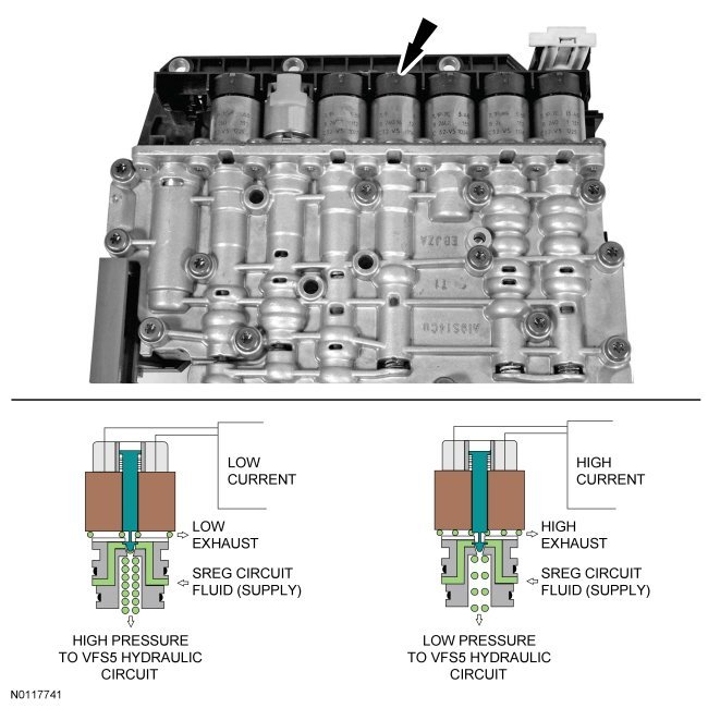With zero current, the LPC (Line Pressure Control) solenoid fully opens the hydraulic valve which applies the maximum amount of hydraulic pressure to the main regulator valve through the VFS5 hydraulic circuit and applies maximum line pressure in the PUMP hydraulic circuit. With maximum current to the solenoid, the hydraulic valve fully closes the outlet port for minimum pressure to the VFS5 hydraulic circuit, lowering the line pressure in the PUMP hydraulic circuit.