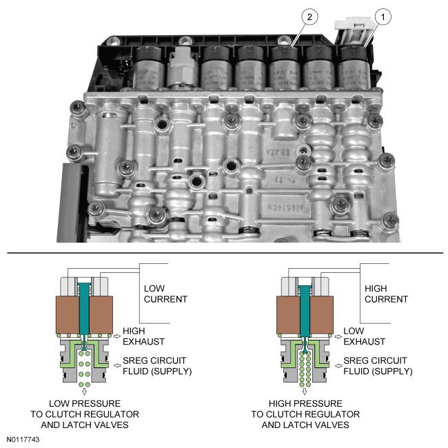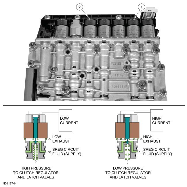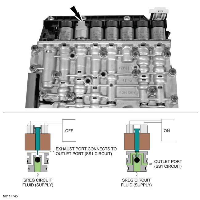 SSA (Shift Solenoid A) and SSC (Shift Solenoid C) use proportional operation. As the current from the PCM decreases, the pressure from the solenoid decreases. As the current from the PCM increases, the pressure from the solenoid increases. SSA (Shift Solenoid A) and SSC (Shift Solenoid C) are supplied hydraulic pressure from the SREG circuit.