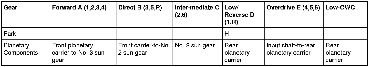 This transmission uses the following clutches to operate the 2 planetary gearsets: