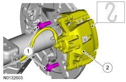 2. NOTICE: Do not allow the caliper assembly to hang from the brake hose or damage to the hose can occur.