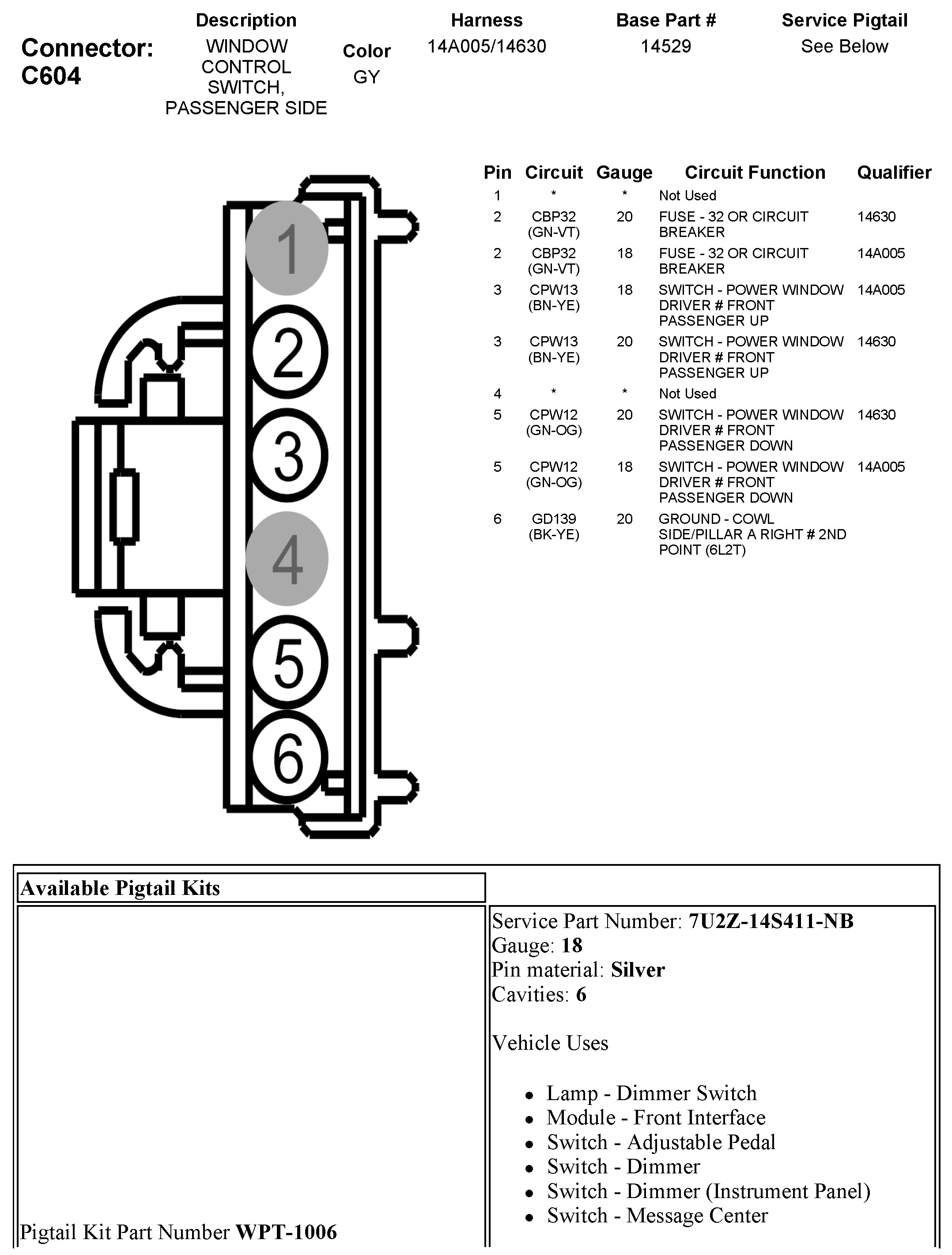 C604 Window Control Switch, Passenger Side