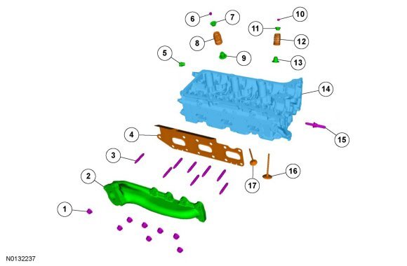 11. NOTICE: Failure to tighten the exhaust manifold nuts to specification a second time will cause the exhaust manifold to develop an exhaust leak.