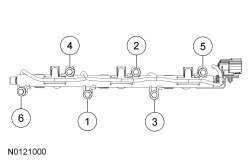 Install the RH fuel rail assembly and the 6 new bolts. Tighten in 3 stages in the sequence shown.