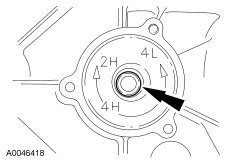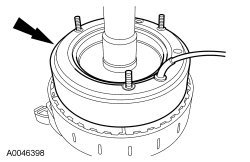 - Position the coil studs through the case holes, making sure the shift cam shaft is aligned with its case bore and the lockup shift fork spring is in position.
