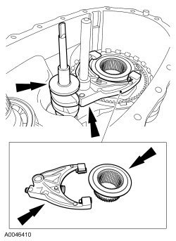 - Separate and inspect the reduction hub and the reduction shift fork for wear or damage. Do not disassemble the shift cam assembly.