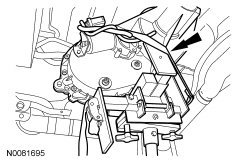 15. Using a transmission jack, position it to the transfer case. Secure the transfer case to the jack with a safety strap.