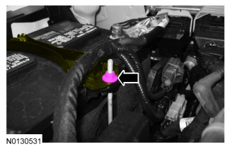 14. Remove the 2 pin-type retainers at the degas bottle and position the battery cable aside.