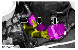 38. Disconnect the 2 PCM electrical connectors and wiring harness retainers.