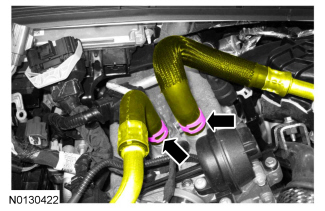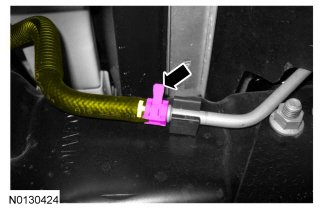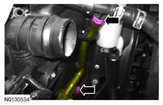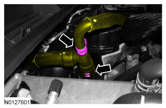 - Release the quick disconnect and disconnect the heater core hose-to-engine.