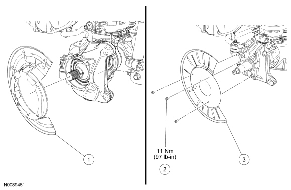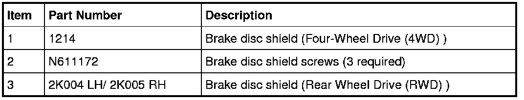1. The wheel bearing and wheel hub must be removed prior to removing the brake disc shield. Remove the wheel bearing and wheel hub.