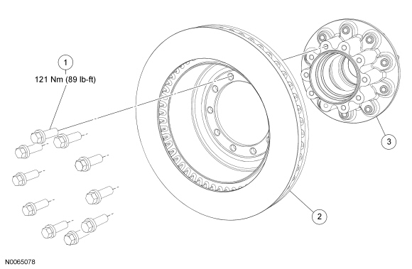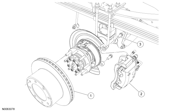 2. NOTE: The brake disc is part of the wheel hub on all DRW (Dual Rear Wheels) axle applications.