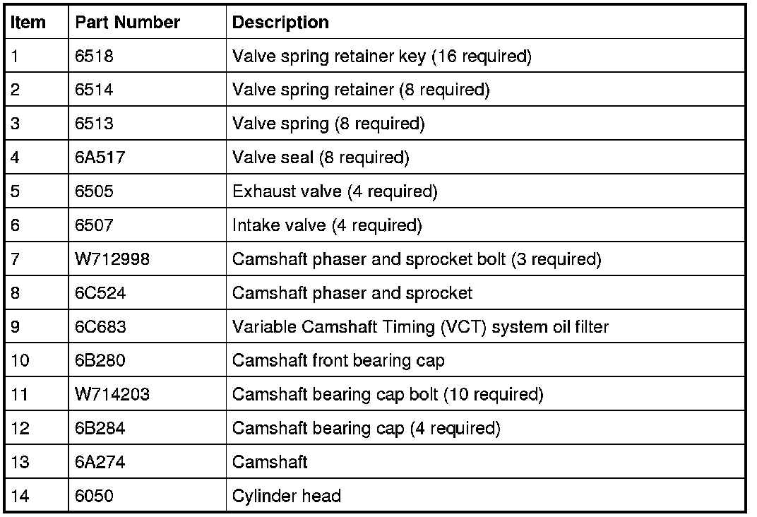 Intake and Exhaust Valves, Valve Springs, Valve Spring Retainer Keys and Retainers, Camshaft Phaser and Sprocket, VCT (Variable Camshaft Timing) System Oil Filter, Camshaft Bearing Caps and Camshaft