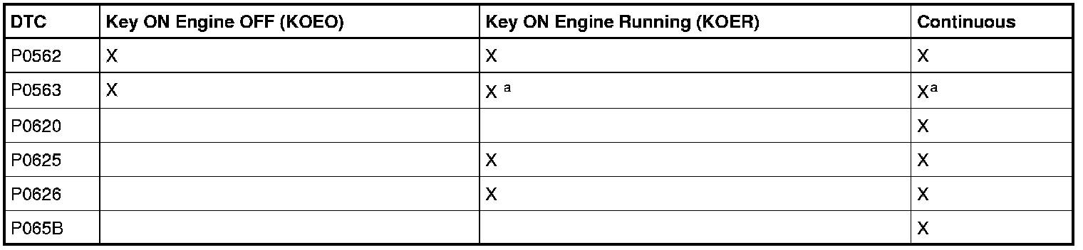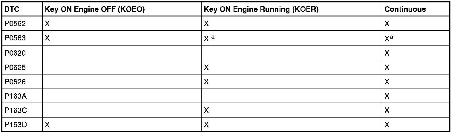 The PCM-controlled charging system, or Smart Charge charging system, determines the optimal voltage setpoint for the charging system and communicates this information to the voltage regulator. The Smart Charge charging system is designed to set 1 of 8 DTCs anytime a charging system fault is present. All of the DTCs can set continuous faults, but not all DTCs set as on-demand faults.
