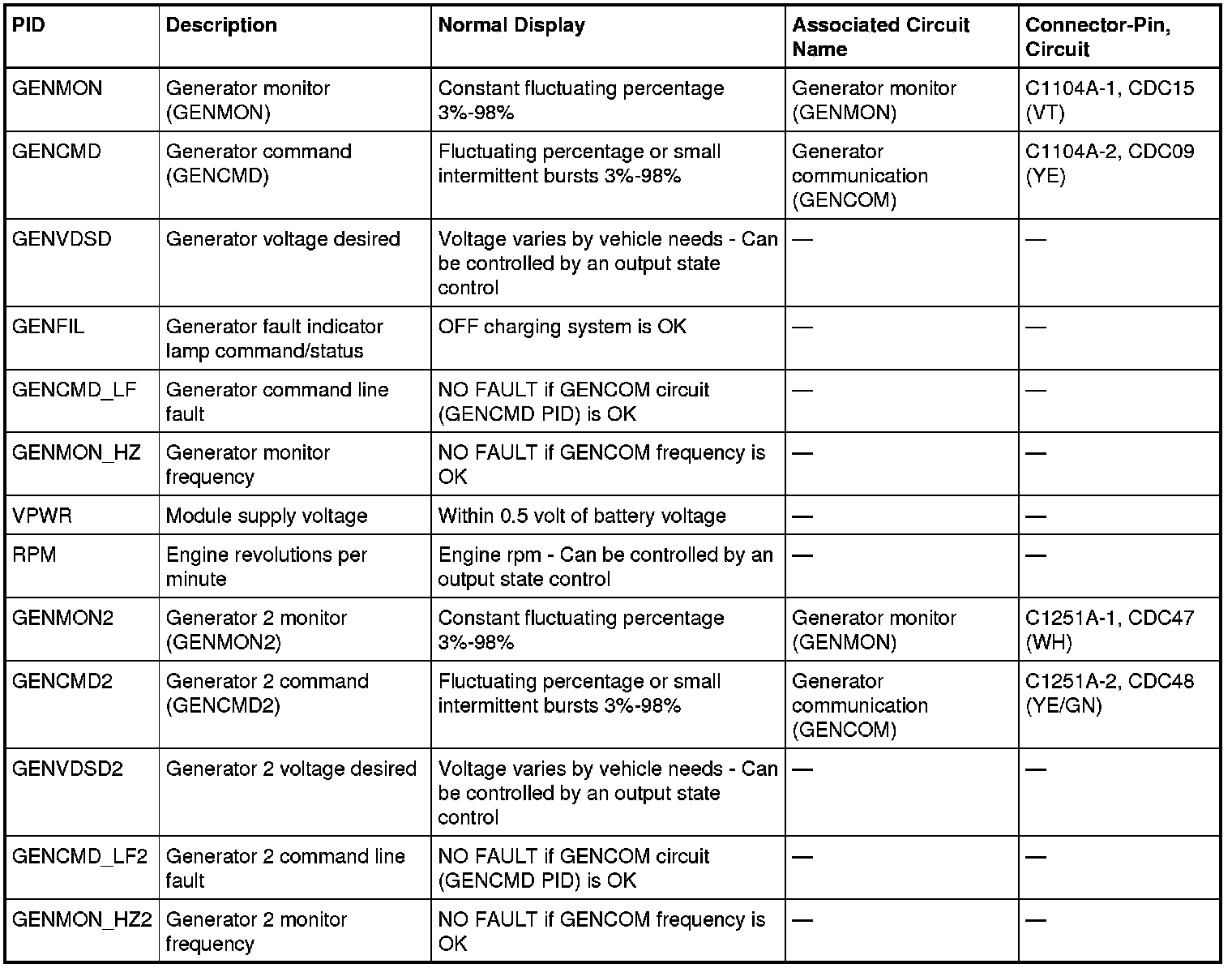 The PIDs and their associated descriptions used in charging system diagnosis are listed below:
