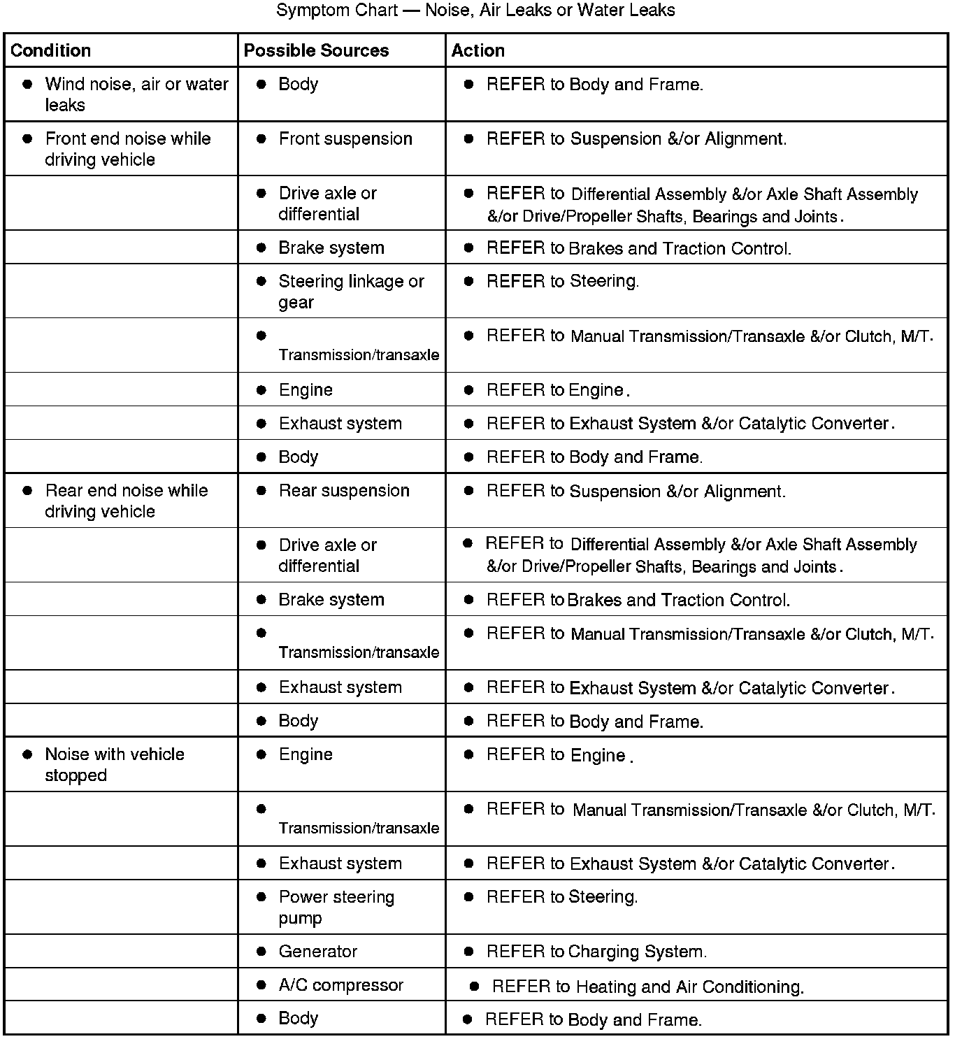 Symptom Chart - Noise, Air Leaks or Water Leaks