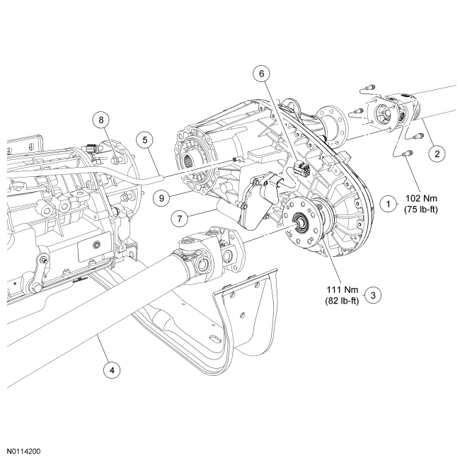 2. NOTE: Hand tighten all transfer case-to-transmission bolts. Torque two bolts to specification that are opposite of each other first. Torque each bolt slowly in steps to avoid binding of the transfer case during tightening. After the first two bolts are torqued to specification, no further tightening sequence is required.
