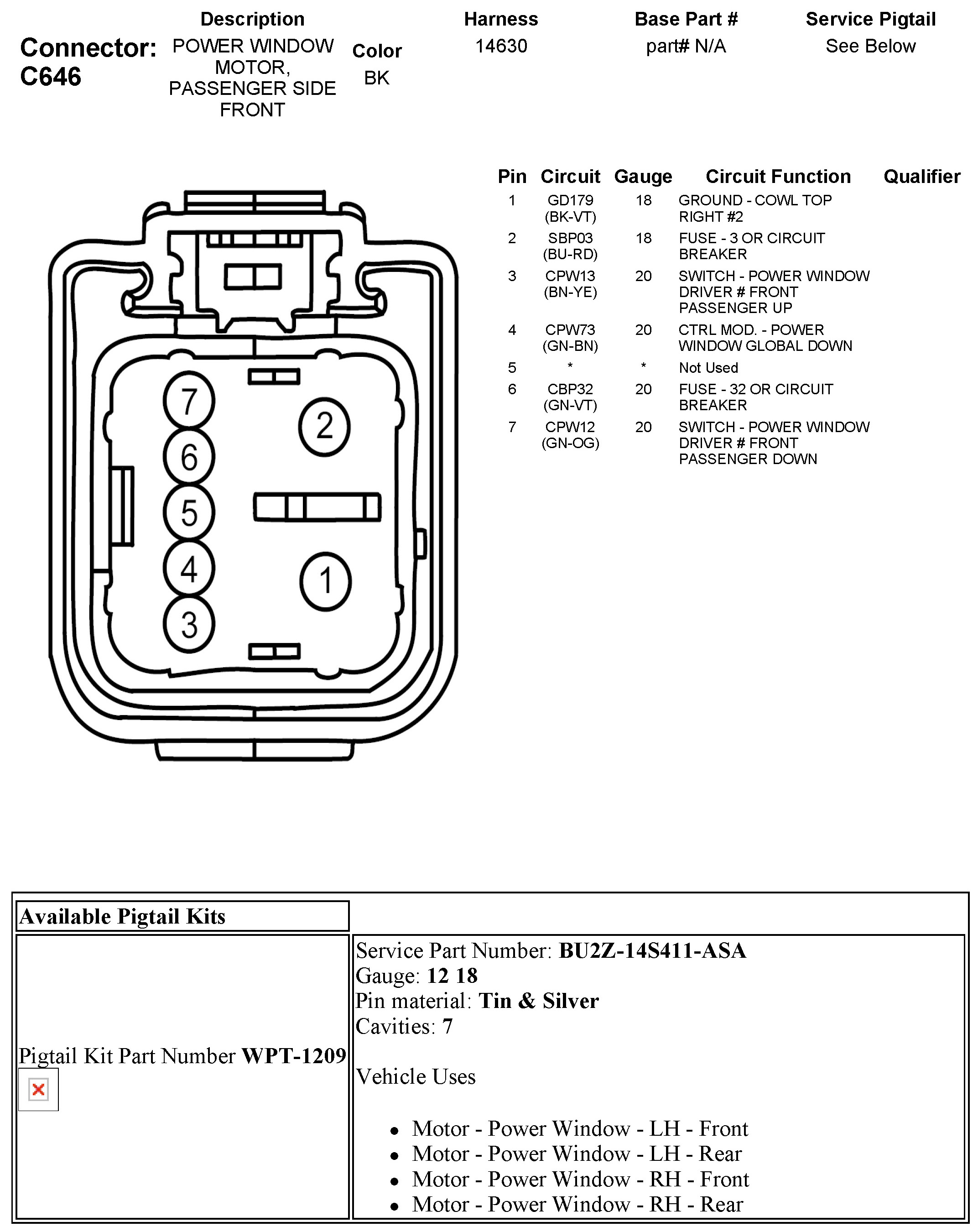C646 Power Window Motor, Passenger Side Front