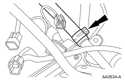 27. Connect the A/C compressor electrical connector and attach the wiring harness retainer.