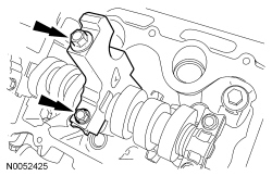 23. NOTICE: Remove the front thrust camshaft bearing cap straight upward from the bearing towers, or the bearing cap may be damaged from side loading.