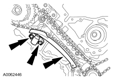 Remove the 2 bolts, the LH timing chain tensioner and tensioner arm.