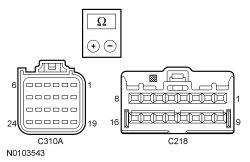 - Measure the resistance between RCM (Restraints Control Module) C310A, harness side and clockspring C218, harness side using the following chart.