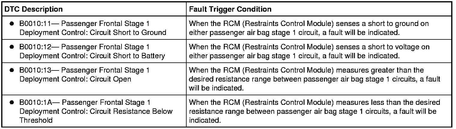 The Restraints Control Module (RCM) continuously monitors the passenger air bag module stage 1 and circuits for the following faults: