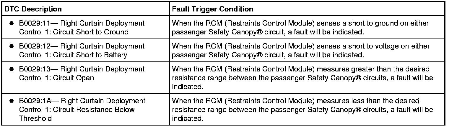 The Restraints Control Module (RCM) continuously monitors the passenger Safety Canopy(R) and circuits for the following faults:
