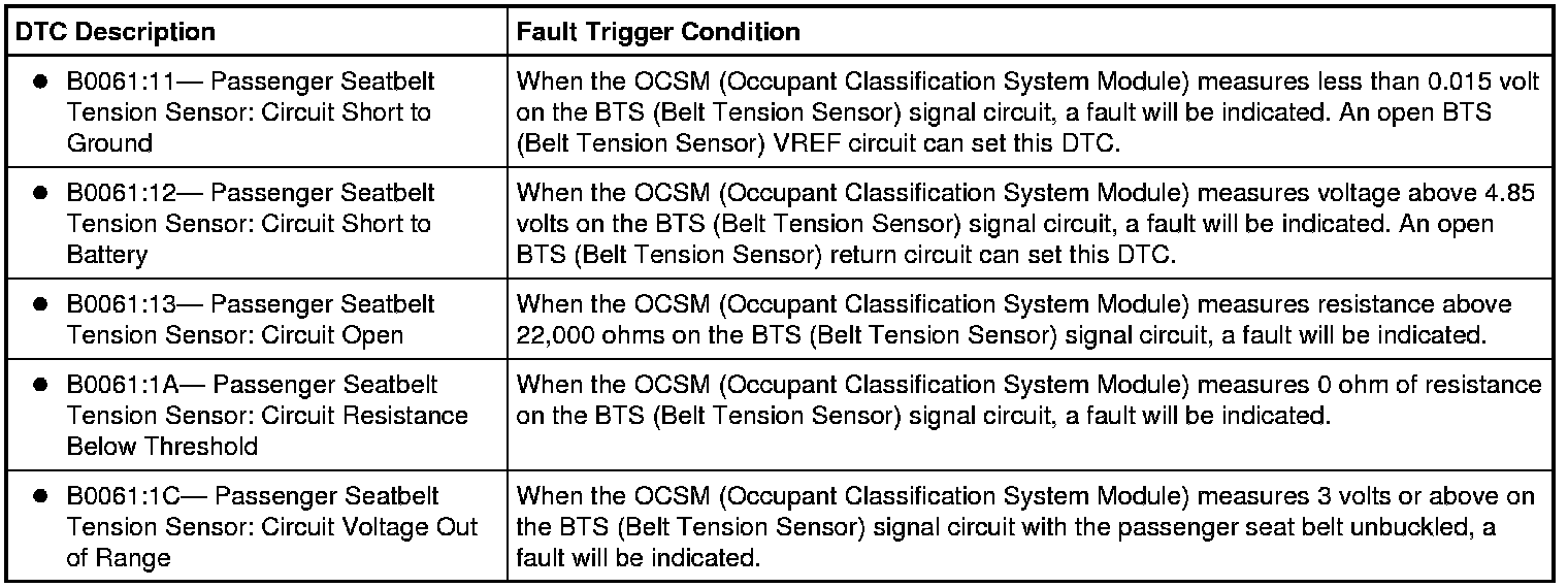 The Occupant Classification System Module (OCSM) monitors the BTS (Belt Tension Sensor) and all circuitry for the following faults: