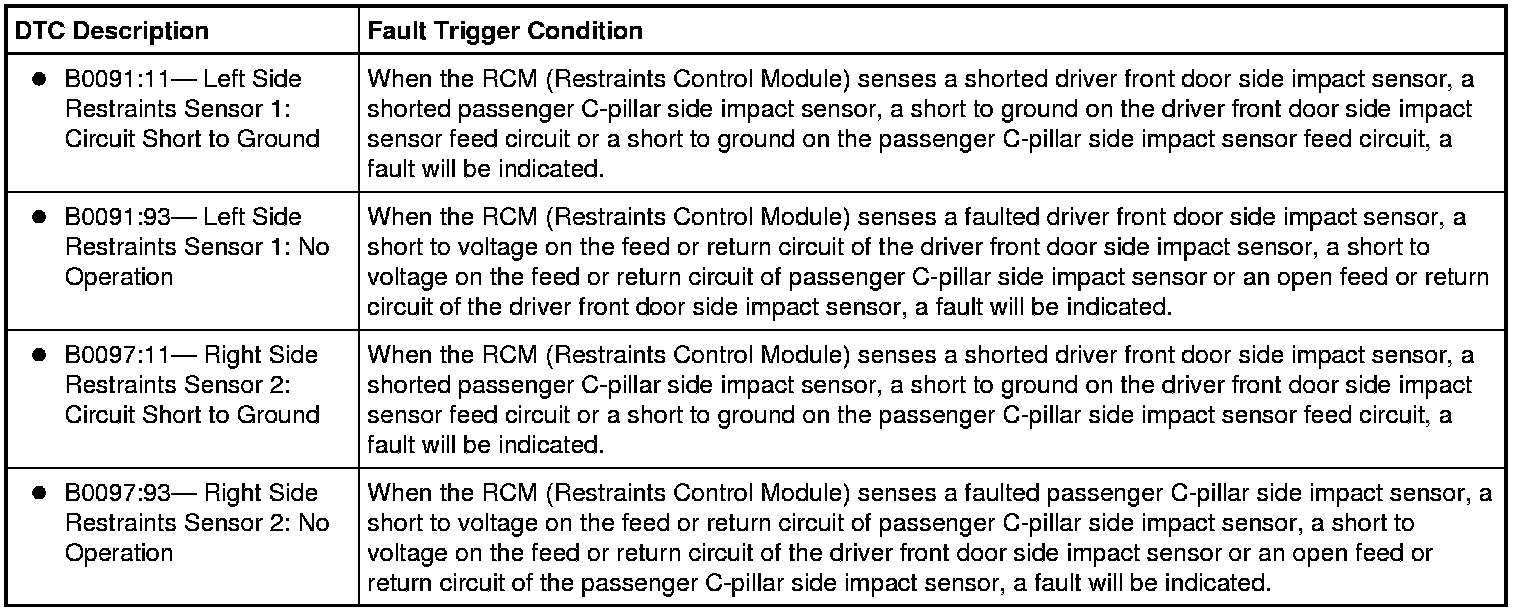The Restraints Control Module (RCM) monitors the driver front door and passenger C-pillar side impact sensors and circuits for the following faults: