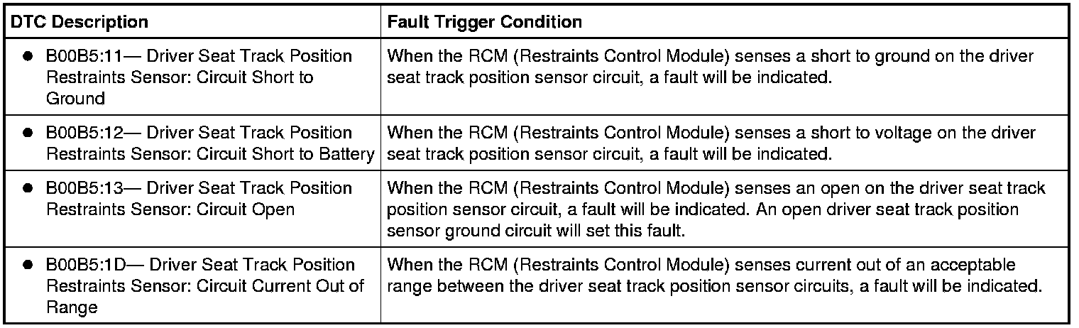The Restraints Control Module (RCM) monitors the driver seat track position sensor and circuits for the following faults: