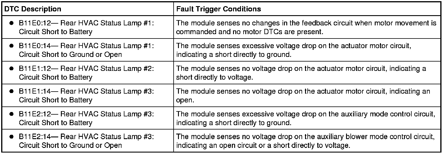 Under normal operation, when each mode is selected on the auxiliary climate control assembly, the HVAC module will illuminate the appropriate auxiliary mode indicators on the auxiliary climate control assembly. The mode indicators are illuminated from the HVAC module.