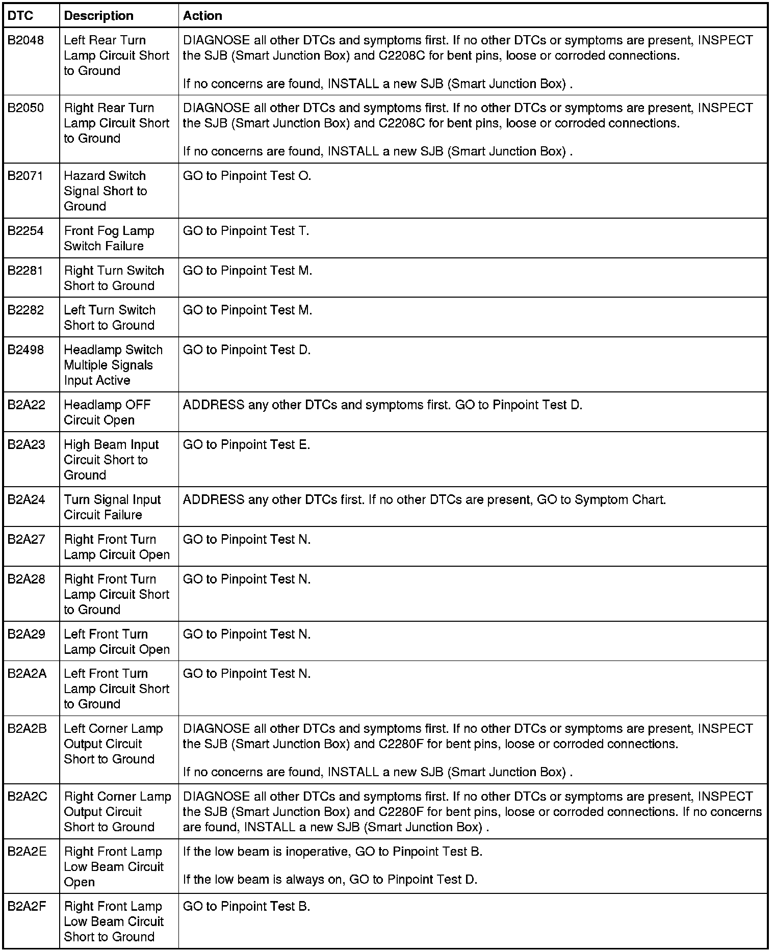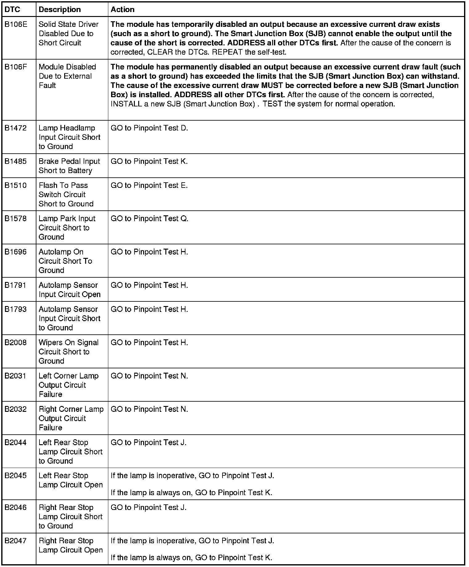 Smart Junction Box (SJB) DTC Chart
