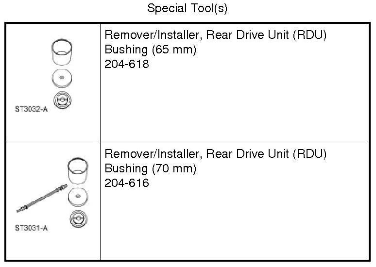NOTE: When installing the RDU (Rear Drive Unit) bushing, Rear Drive Unit (RDU) Bushing (65 mm) Remover/Installer 204-618/2 will fall away as the RDU (Rear Drive Unit) bushing is installed into the subframe. The Rear Drive Unit (RDU) Bushing (70 mm) Remover/Installer does not control the depth of the bushing. The RDU (Rear Drive Unit) bushing is fully seated when the Rear Drive Unit (RDU) Bushing (70 mm) Remover/Installer falls away from the subframe, do not continue to tighten the Rear Drive Unit (RDU) Bushing (70 mm) Remover/Installer.