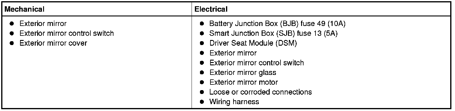 10. If no DTCs related to the concern are retrieved, GO to Symptom Chart- Exterior Mirrors or GO to Symptom Chart- NVH. Symptom Chart - Exterior Mirrors Symptom Chart - NVH