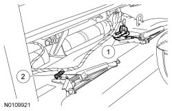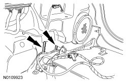 1. Slightly raise the LH load floor flapper panel and detach the wire harness retainer attached to the load floor support studs.