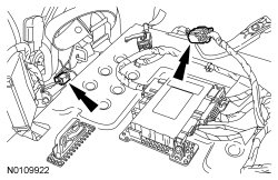 8. NOTICE: If equipped with a power seat, do not lift the load floor flapper panels too far or damage to the wire harness retainers will occur.