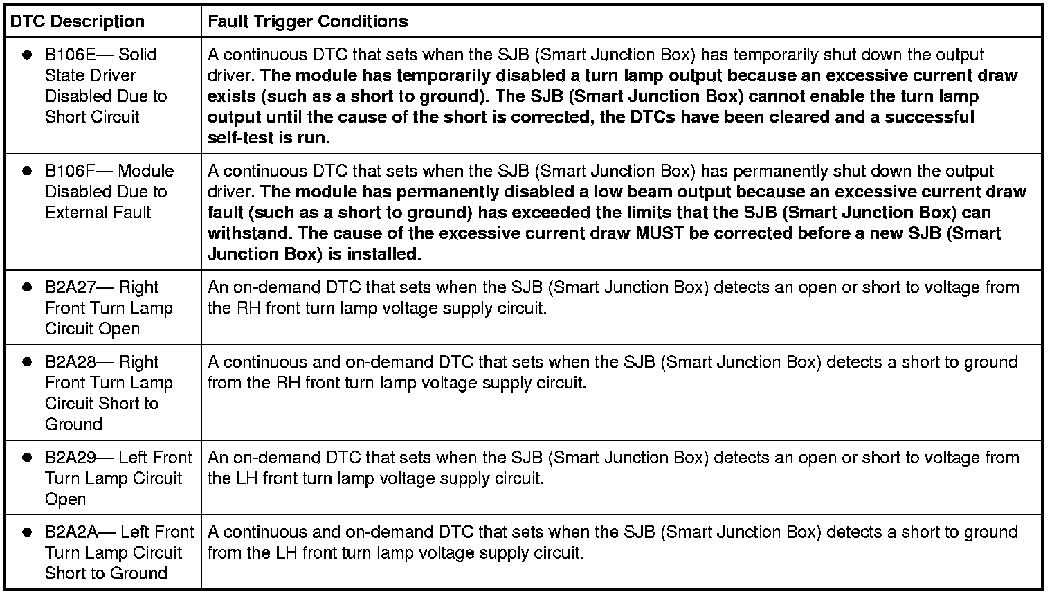 When the Smart Junction Box (SJB) detects the multifunction switch is in the LH TURN position, the SJB (Smart Junction Box) provides voltage to the LH front turn lamp. When the SJB (Smart Junction Box) detects the multifunction switch is in the RH TURN position, the SJB (Smart Junction Box) provides voltage to the RH front turn lamp. The rear turn lamps are controlled utilizing the rear stoplamp circuitry.