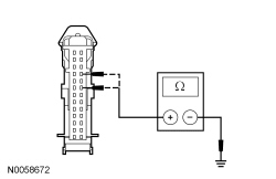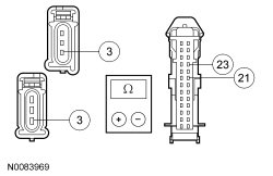 - Measure the resistance between the SJB (Smart Junction Box) C2280F-21, circuit CLS21 (BU/GN), harness side and ground; or between the SJB (Smart Junction Box) C2280F-23, circuit CLS25 (YE/VT), harness side and ground.
