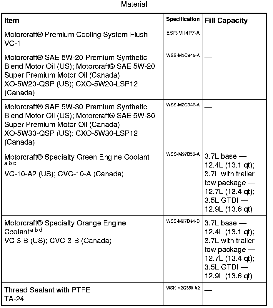 a The cooling system is filled with Motorcraft(R) Specialty Green Engine Coolant or Motorcraft(R) Specialty Orange Engine Coolant. Always fill the cooling system with the manufacturer's specified coolant. Chemically flush the cooling system if a non-specified coolant has been used.
