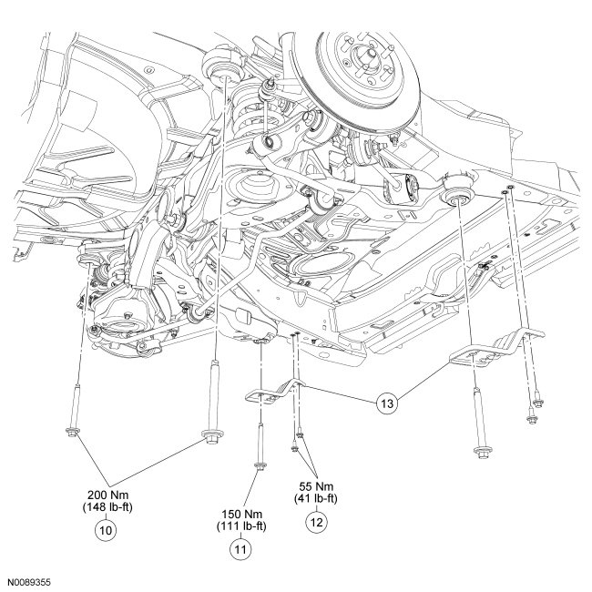 13. Tighten the upper arm-to-subframe forward bolt to 150 Nm (111 lb-ft).