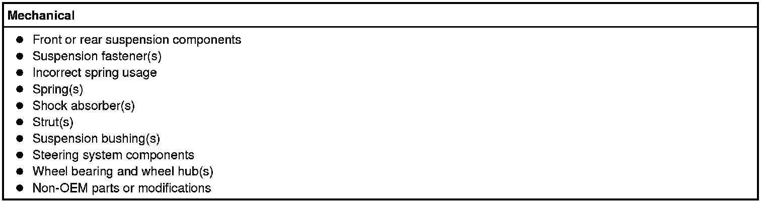 - Check for aftermarket changes to the steering, suspension, and wheel and tire components (such as competition or heavy duty). The specifications shown do not apply to vehicles equipped with aftermarket equipment.