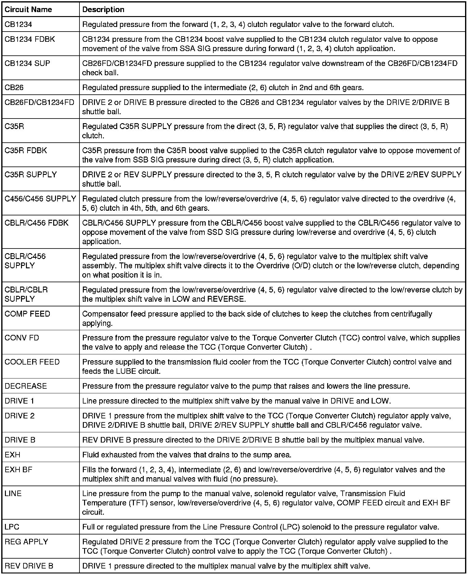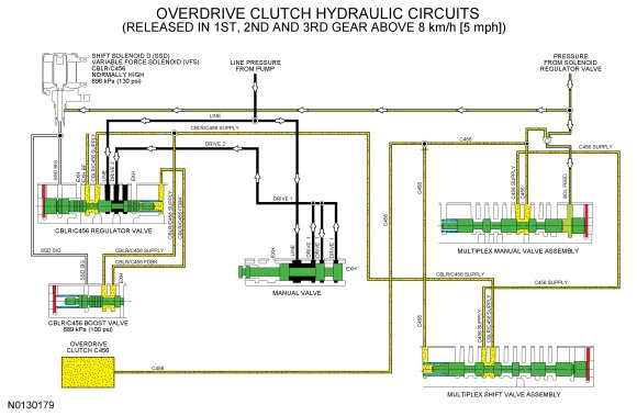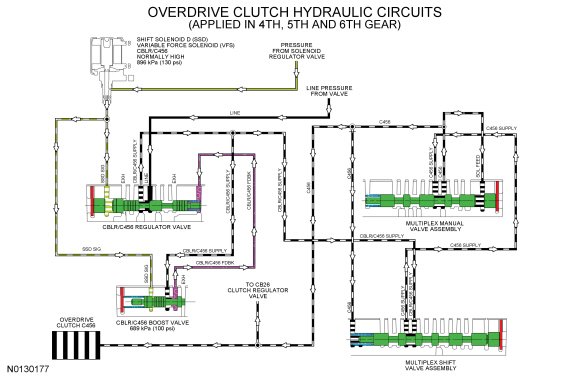 When the overdrive clutch is applied in 4th, 5th and 6th gears, LINE pressure is supplied to the low/reverse/overdrive (4, 5, 6) clutch regulator valve from the pump. To apply the overdrive (4, 5, 6) clutch, SSD (Shift Solenoid D) applies varying solenoid pressure to the CBLR/C456 regulator and boost valves. As the CBLR/C456 regulator valve moves, it supplies the multiplex shift valve assembly and CBLR/C456 boost valve with regulated line pressure through the CBLR/C456 SUPPLY circuit. The CBLR/C456 boost valve directs the regulated line pressure to the opposite side of the CBLR/C456 regulator valve through the CBLR/C456 FDBK circuit for gradual overdrive (4, 5, 6) clutch engagement. The multiplex shift valve directs the regulated pressure to the multiplex manual valve through the C456 SUPPLY hydraulic circuit. The multiplex manual valve directs the regulated pressure to the overdrive (4, 5, 6) clutch through the C456 hydraulic circuit. The C456 circuit also supplies pressure to the CB26 clutch regulator valve to boost the pressure from SSC (Shift Solenoid C) in 6th gear.