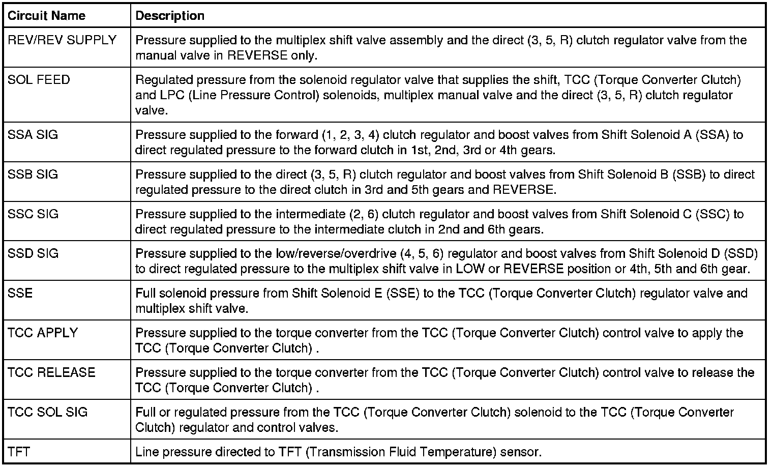 When the low/reverse clutch is applied in REVERSE, LINE pressure from the pump is directed to the multiplex shift valve manual by the valve through the REV hydraulic circuit to move the valve. Line pressure is also supplied to the low/reverse/overdrive (4, 5, 6) clutch regulator valve from the pump. The low/reverse/overdrive (4, 5, 6) clutch regulator valve is controlled by SSD (Shift Solenoid D) and directs regulated pressure to the multiplex shift valve. The multiplex shift valve directs the regulated pressure to the low/reverse clutch through the CBLR SUPPLY circuit.