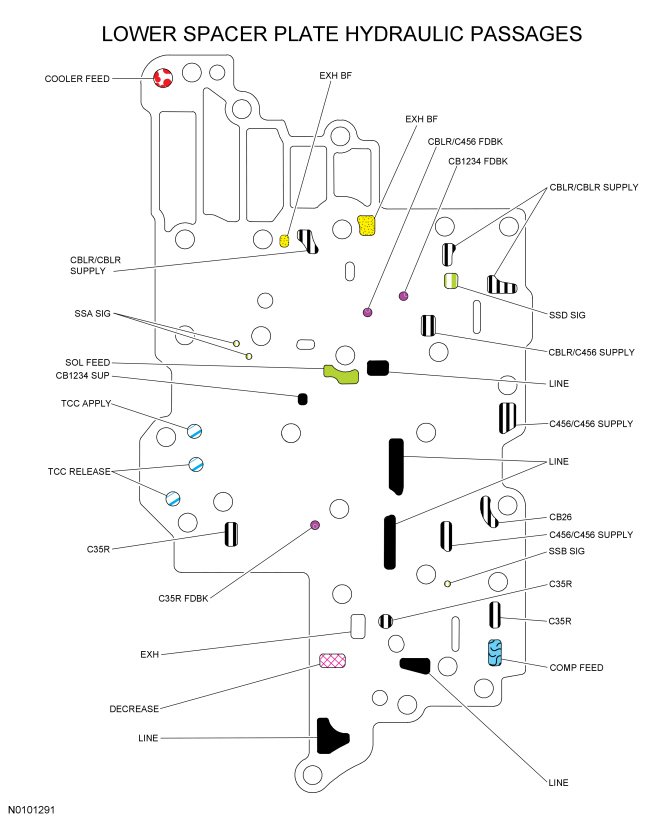 When the low/reverse clutch is released in 1st (above 8 km/h [5 mph]), 2nd and 3rd gears, LINE pressure is supplied to the low/reverse/overdrive (4, 5, 6) clutch regulator valve. Solenoid pressure is not applied to the low/reverse/overdrive (4, 5, 6) clutch regulator valve and the regulator valve blocks regulated LINE pressure to the multiplex shift valve assembly.