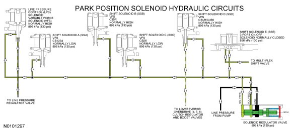 In PARK position, Shift Solenoid D (SSD) directs pressure to the low/reverse/overdrive (4, 5, 6) regulator and boost valves through the SSD SIG hydraulic circuit. Shift Solenoid E (SSE) directs pressure to the multiplex shift valve to direct regulated pressure from the low/reverse/overdrive (4, 5, 6) regulator valve to the low/reverse clutch.