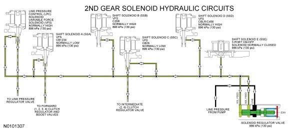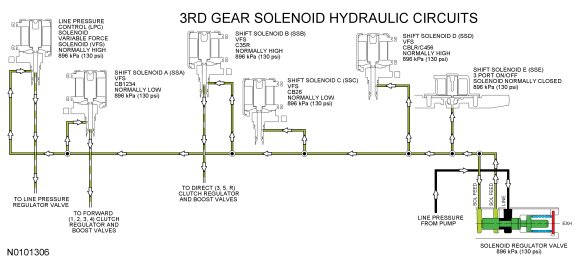 LINE pressure from the pump is directed to the individual shift, TCC (Torque Converter Clutch) and LPC (Line Pressure Control) solenoids by the solenoid regulator valve on the SOL FEED circuit. The solenoids, controlled by the PCM, direct the fluid to the valves that they control.