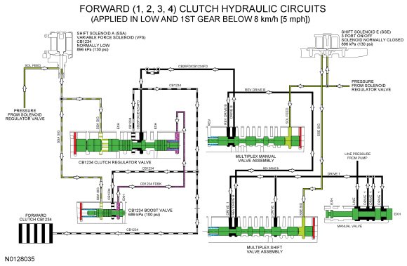 When the forward (1, 2, 3, 4) clutch is applied in LOW position and 1st gear (below 8 km/h [5 mph]), LINE pressure from the pump is directed to the multiplex shift valve by the valve through the DRIVE 1 hydraulic circuit. The multiplex shift valve directs the pressure to the multiplex manual valve through the REV DRIVE B circuit. The multiplex manual valve directs the REV DRIVE B pressure to the forward (1, 2, 3, 4) clutch regulator valve through the DRIVE B, CB26FD/CB1234FD and CB1234 SUP circuits. SSA (Shift Solenoid A) supplies varying solenoid pressure to the CB1234 clutch regulator and boost valves. As the CB1234 clutch regulator valve moves, it supplies the forward (1, 2, 3, 4) clutch and CB1234 boost valve with regulated line pressure through the CB1234 circuit. The CB1234 boost valve directs the regulated line pressure to the opposite side of the regulator valve through the CB1234 FDBK circuit for gradual forward (1, 2, 3, 4) clutch engagement.