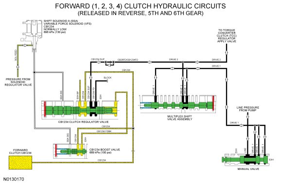 When the forward (1, 2, 3, 4) clutch is applied in 1st (above 8 km/h [5 mph]), 2nd, 3rd and 4th gears, LINE pressure from the pump is directed to the multiplex shift valve by the manual valve through the DRIVE 1 hydraulic circuit. The multiplex shift valve supplies the forward (1, 2, 3, 4) clutch regulator valve with pressure through the DRIVE 2, CB26FD/CB1234FD and CB1234 SUP hydraulic circuits. The forward (1, 2, 3, 4) clutch regulator valve directs regulated pressure to the forward (1, 2, 3, 4) clutch through the CB1234 hydraulic circuit.