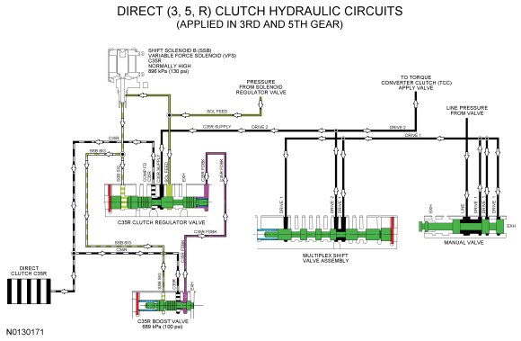 When the direct (3, 5, R) clutch is applied in REVERSE, LINE pressure from the pump is directed to the multiplex manual valve by the valve through the REV hydraulic circuit. The multiplex manual valve supplies the direct (3, 5, R) clutch regulator valve with pressure through the REV SUPPLY and C35R SUPPLY hydraulic circuits. To apply the direct (3, 5, R) clutch, SSB (Shift Solenoid B) applies varying solenoid pressure to the C35R clutch regulator and boost valves. As the C35R regulator valve moves, it supplies the direct (3, 5, R) clutch and C35R boost valve with regulated line pressure through the C35R circuit. The C35R boost valve directs the regulated line pressure to the opposite side of the C35R clutch regulator valve through the C35R FDBK circuit for gradual direct (3, 5, R) clutch engagement.